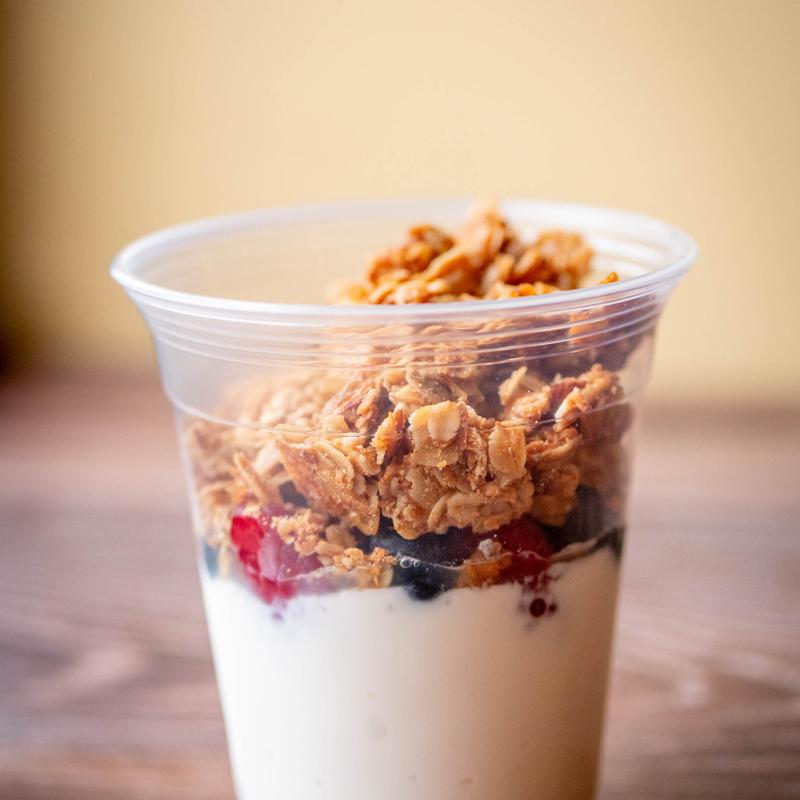 Greek yogurt topped with fresh blueberries, raspberries & house-made granola